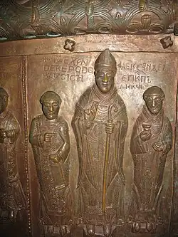 He was bishop from 1129 to 1156 AD and was responsible for the construction of the current Cathedral of Płock in 1144.[1] Aleksander is depicted in a figurative bas-relief on the original cathedral doors now in Velikiy Novgorod. Depiction here is a copy currently hanging in Płock.
