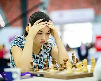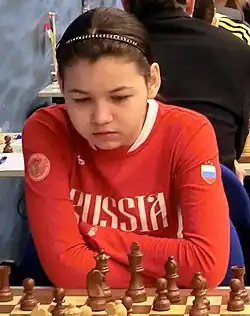 Goryachkina's first youth team success was when she led Russia to a gold medal while scoring 3/3 on the top board at the under-18 girls' European Team Championship in 2012.[86] She played the second board at the under-16 Chess Olympiad in 2014 behind David Paravyan. Russia finished runner-up to India for a silver medal.[87] Individually, Goryachkina finished fourth on the second board, and won the girls' gold medal. She also won a brilliancy award for her seventh-round game with black against Cemil Can Ali Marandi for dangerously sacrificing a rook and a knight on the kingside.[88][89]