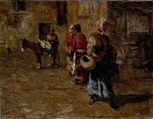 Lupo developed artistically under the guidance of Vittorio Cavalleri, and attended night courses at the Accademia Albertina.[1] He worked within the tradition of late 19th-century Piedmontese Naturalism, influenced in his landscapes by the works of Delleani. His debut at the Turin Società Promotrice di Belle Arti in 1901 with three studies from life was followed by regular participation in the major national events. Though criticised for excessive adherence to the models of his master, his work attracted the attention of the public and critics from 1908 on. The early landscapes painted en plein air gave way to a broader range of subjects until he began to specialise in market scenes and animals during the 1920s. The artist's success in exhibitions and reviews, started with the solo show of 1921 at the Galleria Vinciana, Milan, came to an abrupt end when he was excluded from the Venice Biennale of 1928. He continued to exhibit, however, abroad. Long-term commercial success was nevertheless ensured by the pleasant character of the subjects addressed and a penchant for outmoded 19th-century stylistic mannerisms.