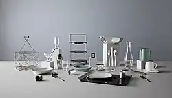 The 1980s marked a period in which Italian design factories had to compete with mass production. These movements had a different view on design, for the Italian design factories the design and therefore the designer was the most important part of the process while for the mass production the design had to be functional and easy to be reproduced.[2] Also in the 1980s, they changed their marketing image from factory to industrial research lab, a place for research and production. For Alessi the 1980s are marked with some designs like the Two tone kettle by Sapper, their first cutlery set Dry by Castiglioni. Alessi collaborated with new designers, including Aldo Rossi, Michael Graves, and Philippe Starck, who have been responsible for the some of Alessi's all-time bestsellers like the kettle with a bird whistle by Graves.
