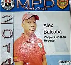 Alex Balcoba Sr. (c. 1961 – 27 May 2016) was a Filipino crime journalist for Brigada Mass Media Corporation Weekly tabloid in Quiapo, Manila, Philippines, and was also known as the deputy director at the Manila Police District Press Corp. He was killed outside a watch repair shop that his family owns in Quiapo. He was one of the many journalist killed in the Philippines in 2016.[3] The case gained international attention after Mayor Rodrigo Duterte was elected president.[4]