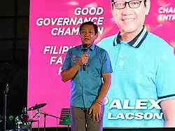 Alexander Ledesma Lacson (born January 5, 1965)[1] is a Filipino bestselling author of patriotic books, a poet, lawyer, businessman, civil society leader, and NGO leader. He is best known as the bestselling author of the books 12 Little Things Every Filipino Can Do to Help Our Country[2] and Five Hundred Years Without Love, for the poem "I am Filipino" and for running in the 2010 Philippine Senate election.[3]