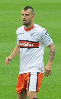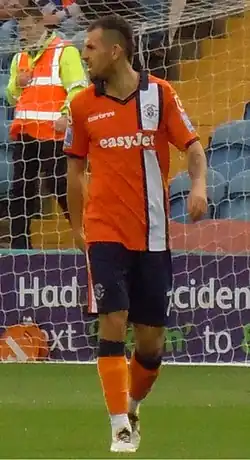 On 8 November 2010, Lawless joined York's Conference Premier rivals Luton Town, initially on loan, with a permanent transfer due to take place in January 2011.[64] York were reluctant to let him leave, but relented when Luton increased their original offer on three occasions.[65] He made his debut in a 1–0 defeat at Wrexham on 11 November 2010 and, in the following game, Lawless scored his first Luton goal with the winner in a 1–0 victory at Altrincham.[66] Lawless signed for Luton permanently for an undisclosed fee on a one-and-a-half-year contract on 5 January 2011.[64][67] His first appearance after signing was as a 74th-minute substitute in a 0–0 draw at Bath City on 8 January 2011.[66][68] After the departure of fellow midfielder Andy Drury to Ipswich Town in late January 2011, Lawless played a much more prominent role in a Luton team that eventually finished the 2010–11 season third in the table. He scored the opening goal, a 35-yard strike described as "superb", in Luton's 3–0 play-off semi-final first leg victory away at Wrexham.[69] He then played in the 2–1 home victory in the second leg,[66] and in the 2011 Conference Premier play-off final against AFC Wimbledon at Wembley he missed the opening penalty kick in the penalty shoot-out, which Luton lost 4–3.[70]