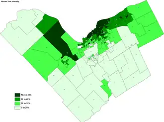 A map showing the concentration of Munter's vote. He won the downtown and his home region of Kanata while doing poorly in the rural areas
