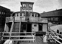 By November 1901, the steamer Idaho was in a critical condition and in need of overhaul. The City Council gave the Wayside Mission permission to build a gridiron at the foot of Jackson street and put the ship on it.[64] But during a severe storm in January 1902, the Idaho broke from its mooring with patients and staff on board. As it was tossed by the waves, its stern was severely damaged by logs that were anchored nearby. People were evacuated from the ship by the city's fire department, and crews of nearby anchored vessels helped to save the boat from sinking, securing it near the wharf.[65] The ship survived the storm and proceeded to be re-moored at its original position.[60][55][66]