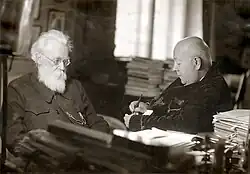 In 1910, Fersman returned to Russia, where he began his administrative and teaching career. He became curator of mineralogy at the Russian Academy of Science's Mineralogical Museum in St. Petersburg, and the museum's director in 1919, following his election as an Academician.[4] Fersman also became a professor at the People's (Shanyavsky) University in Moscow.[5] In 1912, he taught what may have been the world's first courses in geochemistry, and also helped found Priroda (Nature), a popular scientific journal, to which he contributed throughout his life.[8] During World War I, Fersman formed a commission to advise the military on strategic matters involving geology, as he would do later in the Great Patriotic War. He also participated in an Academy of Science project to catalogue Russia's natural resources, and starting in 1915, travelled throughout Russia to assess mineral deposits. Lenin subsequently consulted Fersman for advice on exploiting the country's mineral resources.[4]