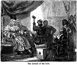 On 16 August, he had been brought to the bar of the justiciary court, and the sentence of death and forfeiture was passed upon him, and 28 September was fixed as the date of his execution. The King ordered the Privy Council of Scotland to put Gordon to the torture of the boots in order to extort from him the names of his accomplices. The council replied that it was irregular to torture malefactors after they had been condemned to death, but the King responded by sending Gordon on 11 September a reprieve till the second Friday of November.[6]