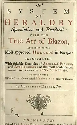 - A System of Heraldry, Speculative and Practical: With the True Art of Blazon, According to the Most Approved Heralds in Europe: Illustrated with Suitable Examples of Armorial Figures, and Achievements of the Most Considerable Surnames and Families in Scotland, &c. Together with Historical and Genealogical Memorials Relative Thereto. (1722) - volume 1 - volume 2.