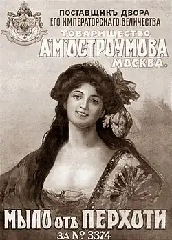 - ^ Rascanu, Dan (March 30, 2022). "English: This is an advertising poster for an anti-dandruff soap produced by A.M. Ostroumov in Moscow – Russian Empire, at the beginning of the XX century. At the top of the image is the coat of arms of the Russian Empire and it says that the company A.M. Ostroumov was purveyor to the court of His Imperial Majesty. This photocopy is after an original photo from the archive of my family Rascanu / Ostroumov" – via Wikimedia Commons.