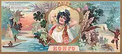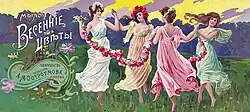 The Ostroumov company employed local stars for their "artists" which fitted in with their narrative of transformative beauty to gain an advantage over their foreign competitors.[12] Among the artists featured was Elisaveta Azerskaya from the Bolshoi Theatre (before the October Revolution it was a part of the Imperial Theatres), who welcomed Ostroumov's perfumery, calling it a serious rival of foreign perfumeries. Wearing an elegant dress, dramatic soprano Leonida Balanovskaya issued the following statement: Since I have become familiar with chemist Ostroumov's 'Cream No.2', I have understood the importance of choosing the right cosmetics. The amazing effect of this cream on the skin is incomparably superior to all other creams.[13] Raisa Reisen, actress from the Imperial Maly Theater in Moskow, jokingly wrote: If Napoleon had used Ostroumov's 'Napoleon' eau de toilette, Josephine would have never cheated on him.[14] Some singers have been shown in character costumes reminiscent of the product names they are praising. Photographed as Cio-Cio-San from "Madame Butterfly" by Giacomo Puccini, the Zimin Opera soprano Vera Liutse opined: The unusually delicate and natural aroma of Ostroumov's 'Japanese Lilac'... reminds me of the native land of this flower, the land of the rising sun and flowers.[15] Based on Liutse's image and text, "Japanese Lilac" alludes to Puccini's popular opera and heroine with the image of Liutse in the kimono of the foreign Cio-Cio-San providing a sense of the exotic. Other Ostroumov products shared the names of opera characters and were more directly associated with celebrities and their distinctive roles. Star Bolshoi soprano Antonina Nezhdanova, who appears as the heroine of the same name in Léo Delibes's opera "Lakmé", explained that she likes the perfumes of the Ostroumov company very much, especially the soap, cologne and powder 'Lakme'.[12]