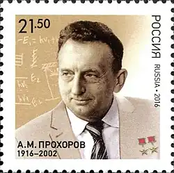 Alexander Mikhailovich Prokhorov[1] (born Alexander Michael Prochoroff, Russian: Алекса́ндр Миха́йлович Про́хоров; 11 July 1916 – 8 January 2002) was an Australian-born Soviet-Russian physicist and researcher whose work focused on quantum electronics. His most famous and well-known works were on optics and electromagnetic research. He was jointly awarded the Nobel Prize in Physics in 1964 with Charles Hard Townes and Nikolay Basov for his fundamental work that led to the development of the laser and the maser.