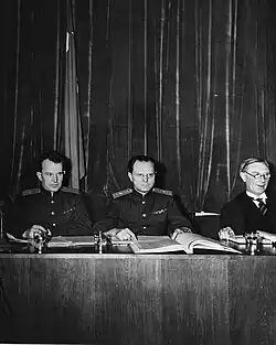 ![]() Russian judges at Nuremberg, left to right: Alexander Volchkov, Iona Nikitchenko. British judge, Norman Birkett sat at extreme right | |