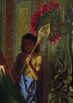 Siemiradzki thoroughly studied the "world of things" of Alexander the Great's time, probably aided by visits to the Hermitage and the Public Library. On his canvas, he accurately depicted antique fabrics, garments, footwear, and armour worn by warriors, as well as ornaments on carpets, and a black-figure vase placed on a table. The exoticism of the Persian campaign is reflected in the oriental opal held by the boy and the tiger skin spread on the bed. At the right edge of the canvas is a statue, at the very top of which is a bronze sculpture of the goddess Nike with a laurel wreath. On the left edge is an antique chair on which royal armour is stacked.[63] On the table is Alexander's helmet, the prototype of which may have been Minerva Giustiniani's helmet.[64] Apparently, when painting it, Siemiradzki used a similar helmet from the academic collection created on the initiative of Alexey Olenin, president of the Academy of Arts from 1817 to 1843.[65][66] In 1980, the helmet was transferred to the museum collection at the Priyutino estate.[67]