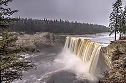 The Alexandra Falls (Slavey: Hatto deh Naili) is a 32 m (105 ft)[1] waterfall located on the Hay River in the Northwest Territories. The falls, the third highest in the NWT, form part of the Twin Falls Gorge Territorial Park and has its own day use area with a 3 km (1.9 mi) trail to the main campsite at Louise Falls (15 m drop),[2] the second of the Twin Falls. Situated on the Mackenzie Highway the falls are about 10 km (6.2 mi) southwest of Enterprise and 43 km (27 mi) southwest of Hay River.[3][4]