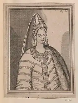 Irina Feodorovna Godunova (Russian: Ирина Фёдоровна Годунова, romanized: Irina Fyodorovna Godunova; 1557 – 26 October 1603[1]), also known by her monastic name Alexandra (Александра), was the tsaritsa consort of all Russia by marriage to Feodor I from 1584 until his death on 17 January [O.S. 7 January] 1598. As her husband died childless, she was the de facto ruler of Russia until she retired to Novodevichy Convent nine days later. She remained the nominal ruler of Russia until her brother Boris Godunov was elected tsar on 3 March [O.S. 21 February] 1598.[2][3][4][5]