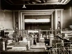 The co-architects of the 1875 Palace were John Johnson and Alfred Meeson. They worked with an expert in stage machinery called Thomas Walford Grieve, son of Thomas Grieve, who designed sets for many London theatres during the 19th century.[6] The stage machinery, housed 22 feet (6.7 m) below the stage, included many different mechanisms to enable scene changes, lower actors through the stage floor (traps) and to enable actors to 'fly' over the stage.[7][4][5]