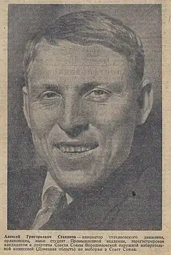 Alexei Grigoryevich Stakhanov (Russian: Алексе́й Григо́рьевич Стаха́нов, IPA: [stɐˈxanəf], Alekséy Grigór'yevich Stakhánov; 3 January 1906 – 5 November 1977) was a Soviet miner, Hero of Socialist Labour (1970), and a member of the CPSU (1936).