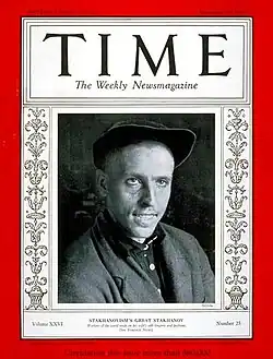 On 19 September, Stakhanov was reported to have set a new record by mining 227 tonnes of coal in a single shift.[3] His example was held up in newspapers and posters as a model for others to follow, and he appeared on the cover of Time magazine in the United States.[4][5][6]