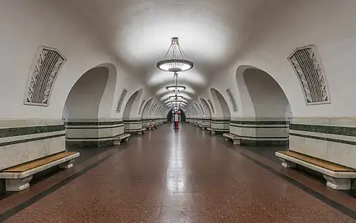 It was designed by S. Kravets, Yu. Kolesnikova, and G. Golubev and opened on 1 May 1958. The station was originally planned to be as heavily decorated as previous stations, but the design was modified due to Khrushchev's opposition to unnecessary decorative elements. As a result, Alexeyevskaya has surprisingly clean lines for a station built in the 1950s. Its octagonal pylons are white marble with green stripes, and the arches, ceiling, and ventilation grilles are painted white. Lighting comes from restrained yet elegant chandeliers.