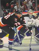 In the offseason, general manager Pierre Gauthier resigned his position and was replaced by Rick Dudley.[78] Yashin was named team captain ahead of the 1998–99 season.[79] He recorded three-point nights in wins on 26 November and 8 December.[80][81] On 18 December, Yashin marked five points, taking part in all of the Senators' goals in a 5–1 victory over the Carolina Hurricanes.[82] Yashin and teammate Ron Tugnutt were selected to represent Ottawa at the All-Star Game in January 1999, with Yashin playing for the World Team, marking the first time the Senators had more than one player attend the game.[83] He followed his All-Star appearance up with three-point games on 30 January and 15 February.[84][85] On 4 March, he recorded a hat trick and four points in a 5–0 shutout win over the Philadelphia Flyers.[86] He marked another three-point game on 8 March, and then two more four-point games on 27 March and 3 April.[87][88][89] He finished the season recording 44 goals and 94 points, tied for second in the league in goal scoring with Jaromír Jágr.[1][90] At the conclusion of the season, Yashin was at the pinnacle of his career as the runner-up for the Hart Memorial Trophy for the NHL's most valuable player, and named an NHL Second Team All-Star.[79][90] Yashin's regular season success did not carry over into the 1999 playoffs, and the Senators were swept in the first round by the Buffalo Sabres. Yashin, as the team's captain was expected to be among the team's best players, but went scoreless in the series.[91] Dudley tried to protect his player by claiming that Yashin was only stopped by the league's best goaltender (Dominik Hašek), but fans and journalists had begun to label him as the "invisible man" for his lack of effort in the playoffs.[91][92]