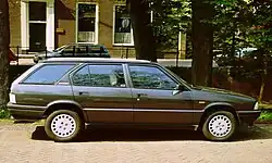 A four-wheel-drive variant, the 33 1.5 4x4, was introduced in at the 1983 Frankfurt Motor Show[10] and put on sale in December.[11] It was assembled by Pininfarina in Grugliasco, Turin.[11] Normally front-wheel drive, the four-wheel drive system could be engaged manually by the driver at any speed, via a handle in front of the gear lever. Like the Quadrifoglio Oro the 4x4 was characterised by two-tone paint, either metallic red or silver separated from a black lower body by a double white pinstripe; the grille matched the body colour. Equipment level was also the same as on the richer Quadrifoglio Oro; ride height was raised in comparison to standard 33s. The 33 1.5 Giardinetta (Estate in the UK), a 5-door estate designed and—like the 4x4 hatchback—assembled by Pininfarina, made its début at the March 1984 Geneva Motor Show.[12] The Giardinetta went on sale in 4x4 guise in June[13] and was joined later in the year by a front-wheel drive model, shown at the Turin Motor Show in November.[14]