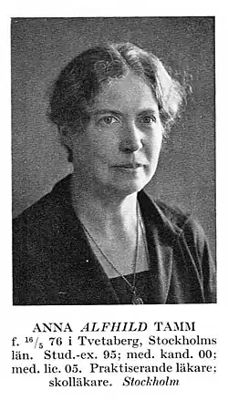 Anna Alfhild Tamm (16 May 1876 – 1 November 1959), was a Swedish physician and the first female psychiatrist in Sweden.[1] She helped introduce psychoanalysis to Scandinavia and was an advocate for treating children's speech and learning difficulties.
