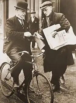Byrne was elected as Lord Mayor of Dublin in 1930,[13][14] serving in the post for nine consecutive years.[15] When cycling or walking around the city he dispensed lollipops to children, who were often seen chasing him down the street. With a handshake and a few words for all, his eternal canvassing soon earned him the first of his nicknames: the Shaking Hand of Dublin.[6] Married with eight children, Byrne treated the people of Dublin as his second family.[16] Every morning he would find up to fifty people waiting for him in the Mansion House. None had appointments. All were met. Byrne answered 15,000 letters in his first year as Lord Mayor.[17] Many were from Dubliners looking for a job, a house, some advice or a reference. One morning in 1931 a journalist watched the Lord Mayor attend to his correspondence. Within an hour he accepted "seventeen invitations to public dinners, one invitation to a public entertainment and eight invitations to public functions." Then he dictated forty-three sympathetic letters to men and women looking for employment.[17] In 1937, children between the ages of eight and eleven years old were being sentenced to spend up to five years in Industrial Schools. Their crime was stealing a few apples from an orchard. When Byrne said such sentences were "savage," a judge responded with a defence of the Industrial School system, urging an end to "ridiculous Mansion House mummery."[18] Byrne stood firm: "For the punishment of trifling offences the home of the children is better than any institution."[19] In 1938, Byrne was favoured by the press for the presidency of Ireland, a ceremonial role created in the new Constitution, but he was outgunned by the political establishment.[20]