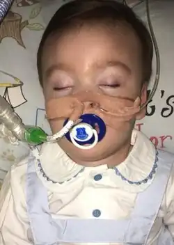 Alfie James Evans (9 May 2016 – 28 April 2018), was an infant boy from Liverpool with an undiagnosed neurodegenerative disorder,[1] later revealed to be GABA-transaminase deficiency.[2] The medical team and the child's parents disagreed about whether to maintain his life support or to withdraw it, resulting in a legal battle. Alder Hey Children's NHS Foundation Trust sought a declaration that continued mechanical ventilation was "unkind and inhumane", and not in the child's best interests. Alfie's parents, Kate James and Thomas Evans, contested the application.