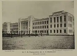 Shanyavsky wished that his wealth would be used for establishing a free university, independent of authorities, where anyone could study. He wrote in his will that his money would go to his wife who would bequeath her wealth to the university. The deed of gift was notarized on the morning of the day that Shanyavsky died. His wife Lidia had to work with Moscow City Duma to help begin the university. A condition was that if the university was not begun before 3 October 1908, the funds would be transferred to the Saint Petersburg Women's Institute. The bureaucracy was slow and the university was founded on 2 October 1908. In the first semester 400 students joined and by 1912 there were 3600 students. The university building was established on Miusskaya Square on 21 July 1911.[1] Shanyavsky was buried in the cemetery of the Novo-Alekseevsky Monastery and in 1921 Lydia was also buried in the same grave. The cemetery and monastery were destroyed in 1930.[2][3]