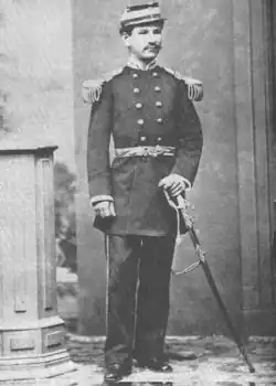 At the beginning of the War of the Pacific, Ugarte was about to leave the country for a business trip to Europe, but instead he decided to stay in order to organize a battalion using his own money.[1] This unit was recruited from the workers and craftsmen of Iquique. It was named "Battalion Iquique N° 1", and it consisted of 429 enlisted men and 36 officers. As he enlisted a whole battalion to the war effort, he was admitted into the army as a colonel.