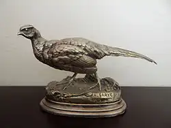 Barye died in Paris in 1882. He is known for the precision detail in his bronze sculptures, as shown in the pheasant sculpture (pictured right).[1] Barye was known for great attention to detail on his bronzes. He produced a number of bird sculptures as well as genre figures.[1] Alfred Barye's final submission at the Salon de Louvre was in 1882. He received posthumous "honourable mention" in the 1897 Salon for the work Aide Fauconnier Indien, Retour de Chasse à la Gazelle.[1]