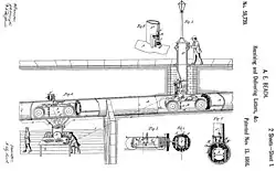 Beach was also interested in pneumatic tubes for the transport of letters and packages, another idea recently put into use in London by the London Pneumatic Despatch Company.[24] He refused to bribe corrupt politician "Boss" Tweed to have his proposal approved.[25][26] Instead, he built the tunnel in secret during the night, carting away the dirt under the cover of darkness, with the city officials at City Hall just across the street.[27][25] He put up $350,000 of his own money to bankroll the project, allowing him to bypass the corruption and extortion schemes of Tammany Hall, which included the Governor, the Mayor, the City comptroller, and countless of other corrupted officials.[27][28] His thinking was that once the public saw the completed subway, the politicians would not dare to stop him.[28] With a franchise from the state, he began construction of a tunnel for small pneumatic tubes in 1869, but diverted it into a demonstration of a passenger railway that opened on February 26, 1870.[29] It is most interesting to note that Beach's tunnel design was likely the first cylindrical tunnel design ever used in the Americas and built using a design inspired by James Henry Greathead's successful shield patents in London for construction of the Tower Subway project. Greathead invented and built his own design of a shield as the contractor for that project, under Peter W. Barlow who was the engineer. Since Beach was a patents lawyer, it is likely he discovered the 1869 Greathead patent and the patent application by Barlow from 1864, using an imitated Barlow's patent design for engineering the PTS tunnel design.