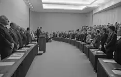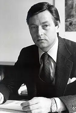 Alfred Herrhausen (30 January 1930 – 30 November 1989) was a German banker and the Chairman of Deutsche Bank, who was born in Essen and assassinated in Bad Homburg vor der Höhe in 1989.[1] He was a member of the Steering Committee of the Bilderberg Group[2] and from 1971 onwards a member of Deutsche Bank's management board. An advisor to Helmut Kohl and a proponent of a unified European economy, he was also an influential figure in shaping the policies towards developing countries.[1][3] He was assassinated, when an explosively formed projectile penetrated his armoured convoy. West German far-left terrorist group Red Army Faction claimed responsibility, but the charges against the organisation were dropped due to lack of evidence and nobody has been charged with the murder since.