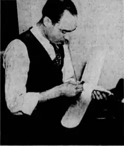 In 1937, he was employed by Bellanca Aircraft.[2] He was profiled for his work on rocket planes.[1] From 1938 to 1950, the Army Air Force, later US Air Force. For three years he led the Jet Propulsion Lab at Wright Field.[7] He was involved in the development of solid-fueled rockets.[8][9] In 1939, he was involved in model plane contests, serving both as a judge and an award-winning participant.[10][11] In 1941, he accompanied Robert Goddard to Roswell army airfield for a test.[12][3] He later observed tests conducted by Jack Parsons and Aerojet. [13] Loedding was involved in Project Sign, the Air Force's nvestigation into flying discs or UFOs.[14] He conducted a 1949 lecture at University of Pittsburgh.[15] In 1958, Loedding was profiled after being awarded a patent for a solid-fueled military rocket.[16][7] In 1959, he was profiled and photographed with a model he called a 'flying pumpkin seed'.[17]