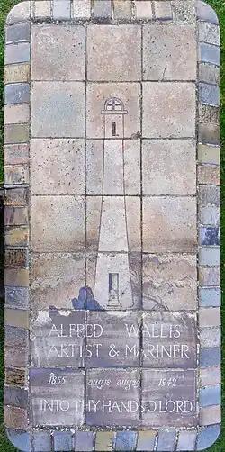 After his death on 29 August 1942, his family funeral at Barnoon Cemetery was interrupted part-way through by his admirers, who then organised a private grave and second funeral, described as “a queer little ceremony”.[1][2] Wallis’s grave lay bare and unmarked for a year and a half until the potter Bernard Leach suggested he make a set of decorative tiles to cover it.[1] Thus Leach created a beautifully unique and fitting memorial, depicting an old man at the foot of a lighthouse – a popular nautical motif in Wallis's paintings. His grave can still be seen today, overlooking Porthmeor beach and Tate St Ives.