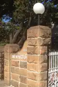 The Stanmore Road boundary of Newington is distinguished by a rusticated stone and wrought iron fence and two sets of entrance gates that were designed by Warden and are now heritage listed.[20] In 1936 the Millner gates were opened after a benefaction by Colonel Thomas Millner MC VD in memory of his father, an Old Boy of Prince Alfred College, Adelaide. In 1938 the second set of gates were opened and named in honour of Frank Edwin Dixon who left £200 to the school in 1929.[21] Dixon's estate also left £500 to the University of Sydney who award an annual chemistry scholarship in his name[22] and £1,000 to the Royal Alexandra Hospital for Children.[23]