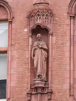 Waterhouse was a great enthusiast for the use of brick, especially as the abolition of the Brick tax in 1850 had lowered the price of the material. Until the early 1870s much of Waterhouse's brickwork was polychrome in nature using decoration such as diapering, later he preferred plain brick often with dressings of contrasting material. His sketchbooks are full of details of brickwork on the continent.[69] He never used coloured tiles on his roofs but occasionally designed patterned slate roofs, as on Manchester Town Hall. He also enjoyed using stone, he delivered a lecture on the subject at the Royal Academy of Art in 1885. He used polychromatic stonework at Manchester Assize Courts.[70] His timber work is characterised by its solidity and large size of the members.