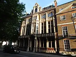 He used terracotta in buildings of all styles from the Romanesque of the Natural History Museum, the Early English Gothic at Girton College, or the Perpendicular Gothic at St Paul's School Hammersmith, even neoclassical at the Parrot House Eaton Hall.[64] When Burmantofts Pottery developed their process to produce faience in 1879 Waterhouse started using it for his interiors. Most notably at The Victoria Building, University of Liverpool; the Chapel, Royal Liverpool Infirmary; Yorkshire College; the National Liberal Club and the final phase of Holborn Bars. He especially liked to clad columns in faience, but walls and fireplaces as well. He also made much use of glazed tiles and terracotta within buildings, for example in the corridors at Manchester Town Hall.[65]