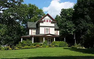 This home has a Colonial Revival architecture, and is an example of a prow house: the front projects from the facade in a way that resembles the prow of a ship. Most prow houses, including this one, have a one-story porch on the remaining three sides.[6]
