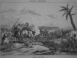 On the morning of 24 June, Algerian forces came back on Staoueli plateau and deployed themselves in front of French outposts.[29] As the 1st French division started marching toward them in column formation, Algerian forces retreated toward the village of Sidi Khalef at the edge of the plateau.[29][31] After some fighting, the Algerians were routed by a bayonet charge.[32] French casualties were very low on that day, but Amédée de Bourmont, one of the French commander-in-chief's four sons, was among the killed.[32]