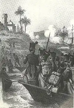 On 29 June, French troops arrived near the Bordj Moulay Hassan fortress, an old Ottoman fortress that the French soon nicknamed "Fort de l'Empereur" as tribute to Emperor Charles V, since it had been built in response to his attack on the city in 1541. On 30 June they started digging trenches in preparation for the siege and by July 3 they had brought all their artillery. In the early morning of July 4, general De la Hitte, commander of the French artillery, ordered all batteries to open fire.[35] The defenders immediately returned fire, and a long cannonade ensued. The fort's garrison, composed of about 800 janissaries and 1,200 Moors,[36] resisted for several hours despite the intense bombardment they were subjected to, a feat of courage that impressed the French.[37] Near 10:00 am however, the defenders of the fort stopped firing as they no longer had any cover after all the merlons had been destroyed.[38] The fortress was devastated and most of its guns had been destroyed. The defenders then gathered what was left of powder and blew up the fortress before fleeing the place.[39] Out of the 2,000 men of the garrison, only half had survived and returned to the Casbah.[35]