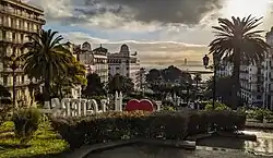 Under French rule, Algiers became the capital of French Algeria, "an integral part of the French Republic" according to a formal annexation declared on June 22, 1834.[25] Following this, interest turned into the completion of the French conquest of Algeria that shared goals with its pacification efforts; Establishing a European cultural, economic and political presence in Africa without considering the indigenous population's lifestyle or connection to their land. Plans to transform the face of the city to match French standards and architectural trends began shortly after obtaining the city. Originally, the Casbah extended to the sea, but it was pushed back to the hills above after demolishing the walls and lower half of the old city and erecting the current "Place des Martyrs",[26] constructing promenades and boulevards that circle the city or face the Mediterranean, tracing new streets and building apartments that are characterized by their "Haussmanian" Style.[27]