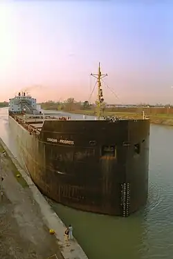 The vessel was laid down on 5 June 1967 at Port Weller Dry Docks, St. Catharines, Ontario with the yard number 48.[1][2] Canadian Progress was launched on 5 July 1968 and completed in August.[1] At launch, Canadian Progress was the largest self-unloading vessel on the Great Lakes.[2] The vessel was used to transport coal, iron ore, barley and road salt through the Great Lakes and the Saint Lawrence Seaway. During its career, the bulk carrier set several shipping records on the Great Lakes.[2][4] On 23 April 1985, Canadian Progress ran aground 5 miles (8.0 km) east of Ogdensburg, New York in the Saint Lawrence River. The ship had been sailing to Chicago, Illinois with a load of coal. To free the ship, tugboats were required to assist Canadian Progress. In 1988, while transporting a load of coal Canadian Progress ran aground on Ballard's Reef, requiring tugboat assistance.[2]