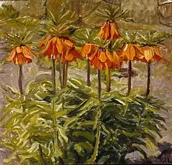 Larsen's subjects were principally flowers, interiors and window views. The colours are rather dark in her early work but she later depicted sunlight shining on her flower arrangements and window scenes. In 1917, she and her husband each had their own studios at Møllebakken next to the winter garden where she was able to develop her painting with more intense colour, sometimes in pastel. In the 1920s, her health deteriorated but she continued to paint, ever more impressionistically, until her death in 1927. After her death, her husband ensured that her work was properly represented in the newly founded Kerteminde Museum.[1]