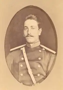 He was part of the army cavalry in the Caucasian army, but later was transferred to the 17th Severskaya Dragoon Regiment on June 29, 1878, according to the newspaper Russky Invalid dated 1 July 1878. According to the “List and certification of Persian princes serving in the troops of the Caucasian Military District” compiled on March 16, 1886, he was described as person with very good morality, diligent in service and having a good faith.[3] From 1886 he commanded various squadrons of the regiment until 1893, when he was sent to the Cavalry Officer School. He was graduated and promoted to captain in 1895.