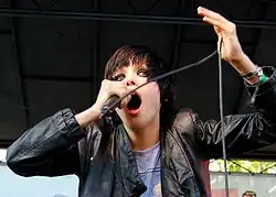Crystal Castles' first official release was their 2006 single "Alice Practice".[9] The song got the band their first record deal with Merok Records in London.[7] The same year, Crystal Castles played their first live show at Clinton's Tavern in Toronto.[10] "Alice Practice" was eventually featured on their eponymous debut album released in 2008. Glass topped NME's Cool List that year and responded to it by criticizing the idea of the cool list itself.[11] The duo followed their debut album with two more critically acclaimed albums, II (2010) and III (2012), completing a trilogy. Glass co-wrote every Crystal Castles song she contributed vocals to.[12] In October 2014, Glass announced her departure from Crystal Castles due to her own professional and personal reasons. In the announcement, she noted that working within the band compromised her efforts towards "sincerity, honesty, and empathy for others".[13] She later had a number of public disagreements with her former bandmate, including accusing him of assault and sexual misconduct.[14]