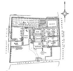 She had inherited not only her uncle's riches but also his influence. By 1492 she was living in London's suburbs at the Augustinian Holywell Priory in Shoreditch where she paid the prioress, Elizabeth Prudde, four pounds of pepper a year.[2] In exchange for this she was allowed to use her well and washing facilities and to make changes to the building's structures. She arranged for her living area to have a view of the church altar and for a locked entrance to her garden. She had her own exit and a dedicated pew in the Lady Chapel;[1] however she lived in two rooms that were just over 18 feet by ten feet.[2]