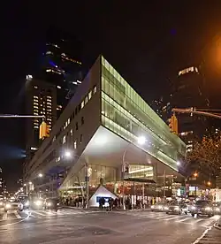 Diller Scofidio + Renfro were chosen in 2003 as the design architects to redevelop Lincoln Center's 65th Street corridor, beating out Norman Foster, Richard Meier, and Santiago Calatrava in a 2002 design competition.[8] The plan called for the adjacent block of 65th Street to be renovated with a more pedestrian-friendly environment.[9] In April 2004, Lincoln Center unveiled the designs by Diller Scofidio + Renfro and FXFOWLE for the first phase of its redevelopment project, which included the expansion of the Juilliard building and the redesign of Alice Tully Hall.[10] The plan received final approval and construction began in March 2006. The plan was praised by many architecture critics, but it also received criticism from preservationists, such as advocacy group Docomomo International, which wished to see the original Belluschi building remain intact. The New York City Landmarks Preservation Commission declined in 2005 to designate Alice Tully Hall as a city landmark. The majority of the controversy has been focused on changes being made to other parts of Lincoln Center, in phase two of the redevelopment project.[11]