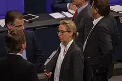 Weidel joined the Alternative for Germany (AfD) in October 2013.[23] According to Weidel, she was first attracted to the party due to her opposition to the euro.[24] She was elected to the federal executive committee of the AfD in June 2015.[25] In April 2017, she was elected co-lead candidate of the party.[15] She is the first lesbian to serve as a lead candidate of her party.[26] She has been identified by the media as belonging to the more moderate conservative Alternative Mitte faction within the AfD.[27][28]