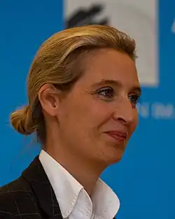 Alice Elisabeth Weidel (German: [aˈliːs eˈliːzabɛt ˈvaɪdl̩]; born 6 February 1979) is a German far-right[1][2][3] politician who has been serving as co-chairwoman of the right-wing populist Alternative for Germany (AfD) party alongside Tino Chrupalla since June 2022.[4] Since October 2017, she has held the position of leader of the AfD parliamentary group in the Bundestag.